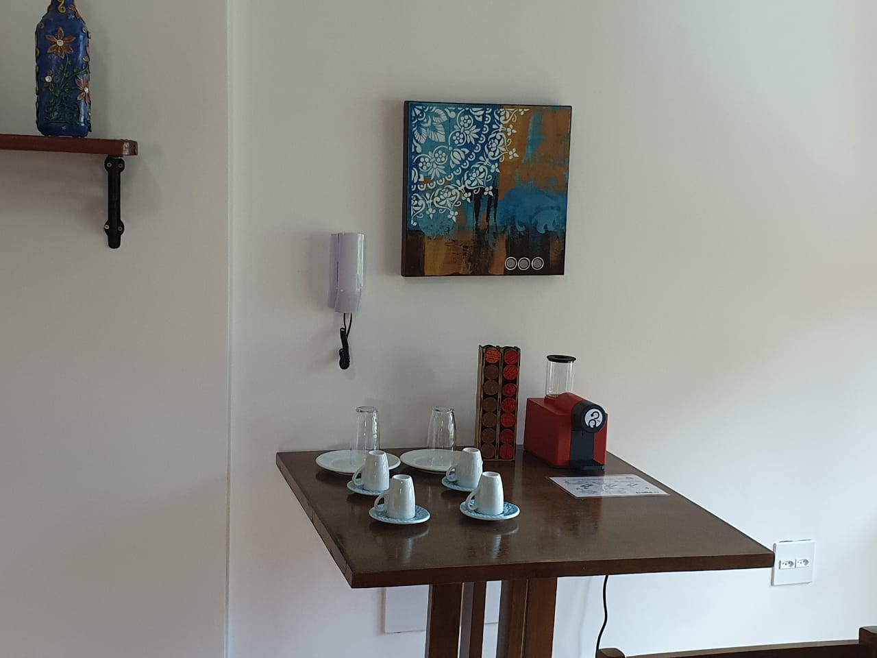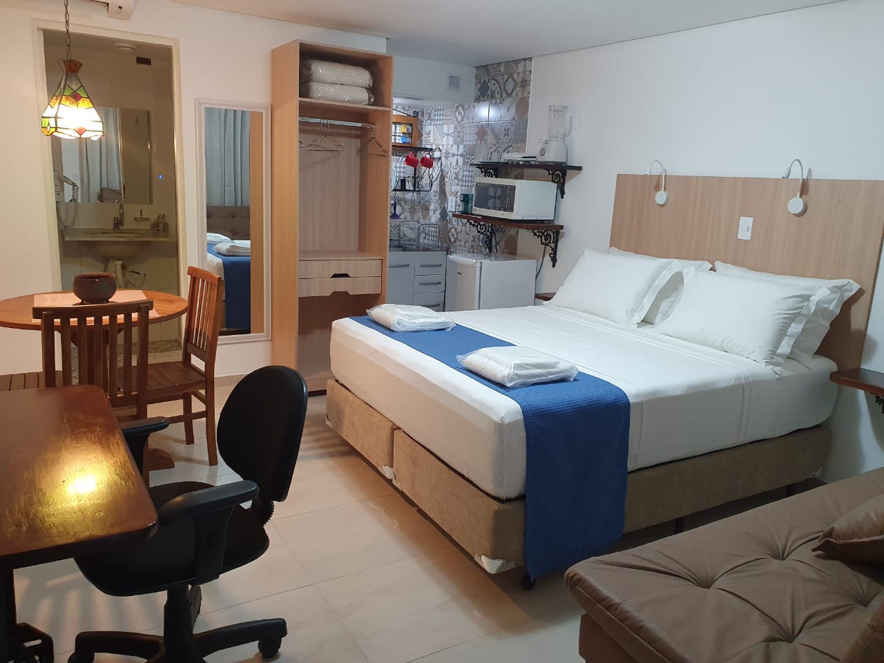 Oferece apartamento tipo estúdio com inúmero diferenciais, entre eles: ar condicionado Daikin Q e F 12.000 BTU's, TV 43" com canais abertos, Netflix, YouTube, Internet de alta velocidade, maquina de café expresso com blends importados (vendidos separadamente), microondas, sanduicheira, liquidificador, frigobar, copa completa, colchão de 33cm, água quente e fria no banheiro e cozinha, cortina black-out.